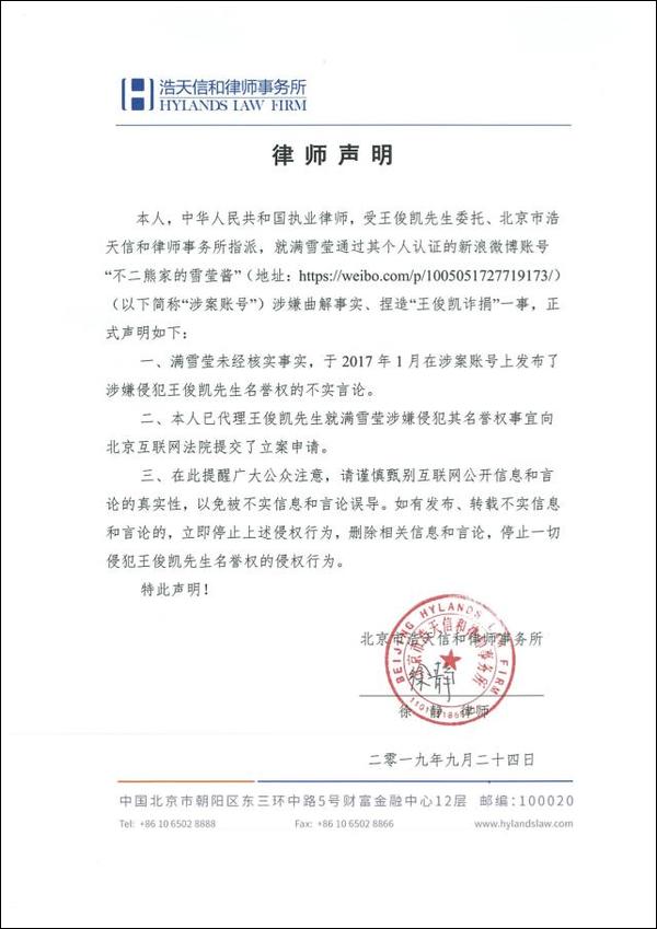 9月24日,王俊凱的工作室就滿雪瑩涉嫌曲解事實、捏造“王俊凱詐捐”一事發表律師聲明。