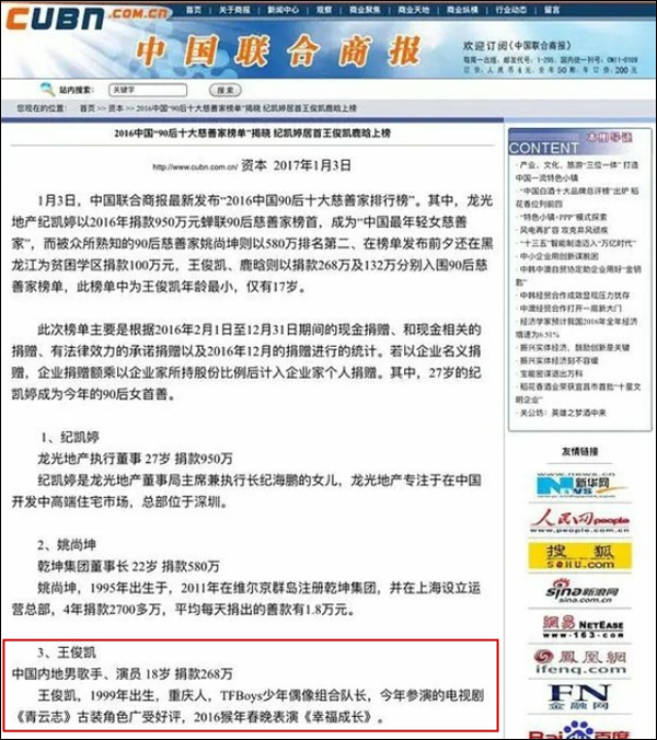 2017年1月3號,中國聯合商報作為源頭,發佈了一篇《2016中國90後十大慈善家榜單揭曉 王俊凱鹿晗上榜》的報道。