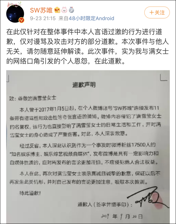 此前因“詐捐事件”,王俊凱粉絲@SW蘇唯 對滿雪瑩進行言辭過激的網絡暴力攻擊。滿雪瑩訴諸法律後近期獲得勝訴結果,@SW蘇唯 隨後發表公開道歉信。