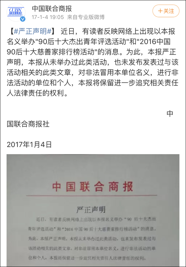 隨後中國聯合商報也發表聲明表示,從未舉辦過此類慈善排名活動,也從未發佈過與該活動相關的此類文章。