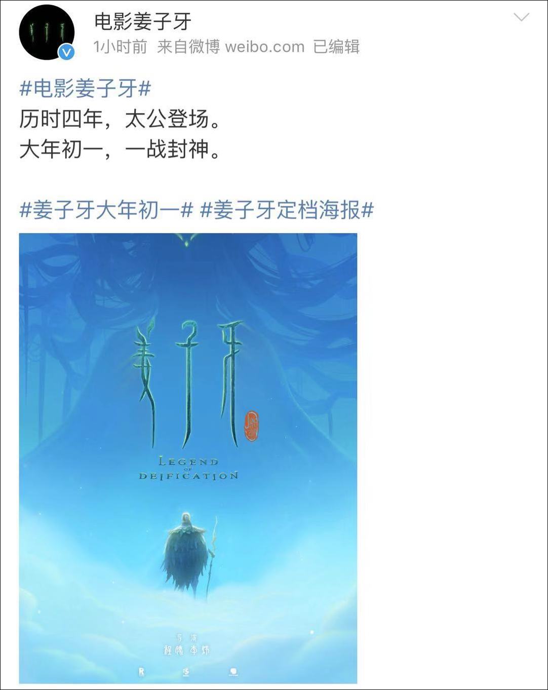 歷時四年,終於,今天上午,官微宣佈,電影定檔。出品公司@彩條屋 表示:《哪吒》之後,太公登場,期待中國封神宇宙。
