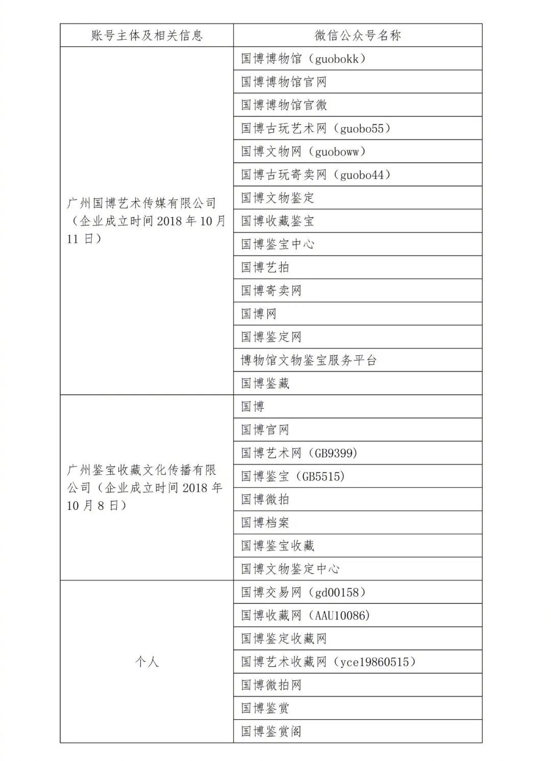 三、經查,上述多個假冒中國國家博物館名義的微信公眾號均由廣州鑑寶收藏文化傳播有限公司(成立時間2018年10月8日)和廣州國博藝術傳媒有限公司(成立時間2018年10月11日)註冊管理。我館要求上述公司和個人[H1] 立即停止侵權行為。否則,中國國家博物館將採取一切必要措施,追究相關單位和個人的法律責任。
