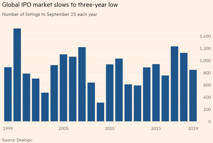 報道稱,數據供應商迪羅基公司(Dealogic)的數據顯示,**今年以來全球共有845家公司進行IPO,**較2018年同期減少25%,為三年來最低水平。而在這些交易中,企業共計籌集1160億美元,較去年減少23%,為2016年以來的最低水平。
