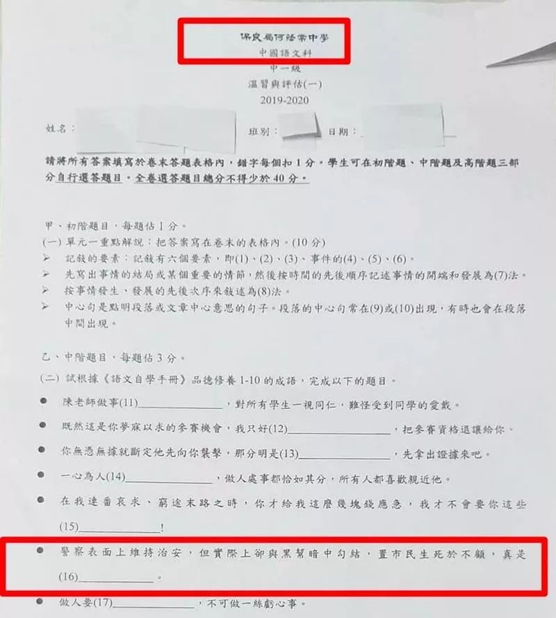 香港一老師出題稱“警察與黑幫勾結”,校方發嚴正聲明