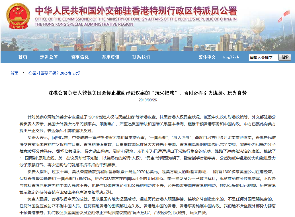9月26日,外交部駐香港特別行政區特派員公署刊發題為“駐港公署負責人敦促美國會停止推動涉港議案的“玩火把戲”,否則必將引火燒身、玩火自焚”的聲明。