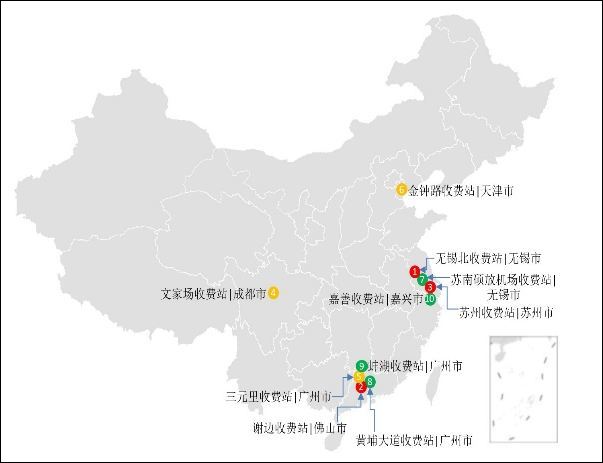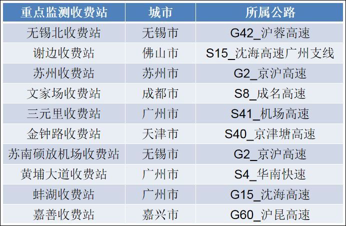 基於歷史數據及可能的天氣環境,預計國慶假期較繁忙的收費站主要有:無錫北收費站、蘇南碩放機場收費站,佛山謝邊收費站,蘇州收費站,成都文家場收費站,廣州三元里收費站、黃埔大道收費站、蚌湖收費站,天津金鐘路收費站,嘉興嘉善收費站等。