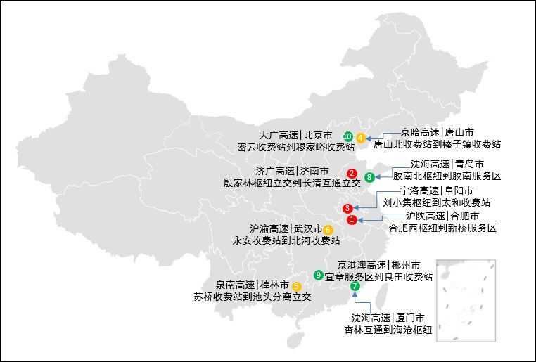 除大中城市周邊高速公路、收費站以外,城市機場、火車站、熱門景區公路局部路段也可能成為易擁堵區域。