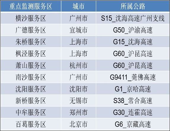 預計,較繁忙的服務區主要有廣州橫沙服務區,南沙服務區,宣城廣德服務區,上海朱橋服務區,楓涇服務區,杭州蕭山服務區,遼寧瀋陽服務區,無錫新橋服務區,蘇州陽澄湖服務區、鄭州中牟服務區,北京百葛服務區等。