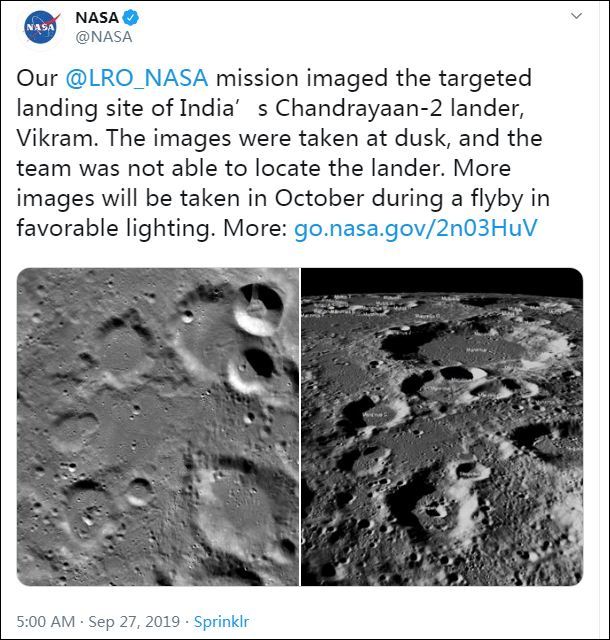印度失聯“月船2號”目標着陸點照片公佈,NASA:硬着陸