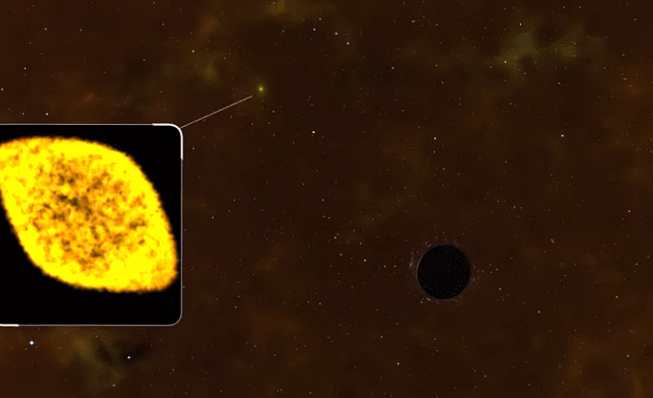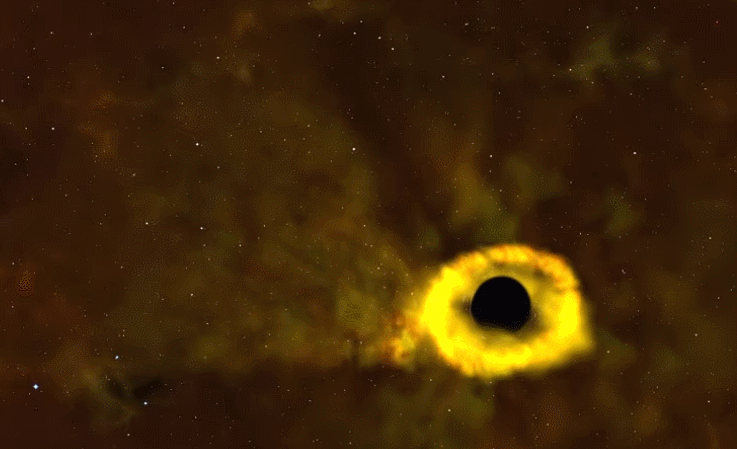 隨後,表面看似平靜無波的黑洞散發出巨大的威力,將恆星吸附在其周圍,撕碎成粉末: