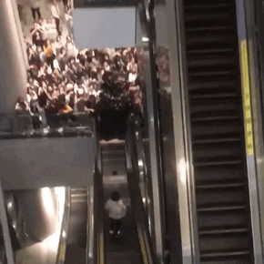 從當時的視頻中可以看到,大批粉絲擠在樓梯口,後排的粉絲伸長了脖子,前排的粉絲不得不繼續向前,電梯承重、旁邊只到腰部的圍欄到底能不能承受得住這麼多人沒有人考慮,只留下保安站在前排試圖緩解這驟然增多的人羣。
