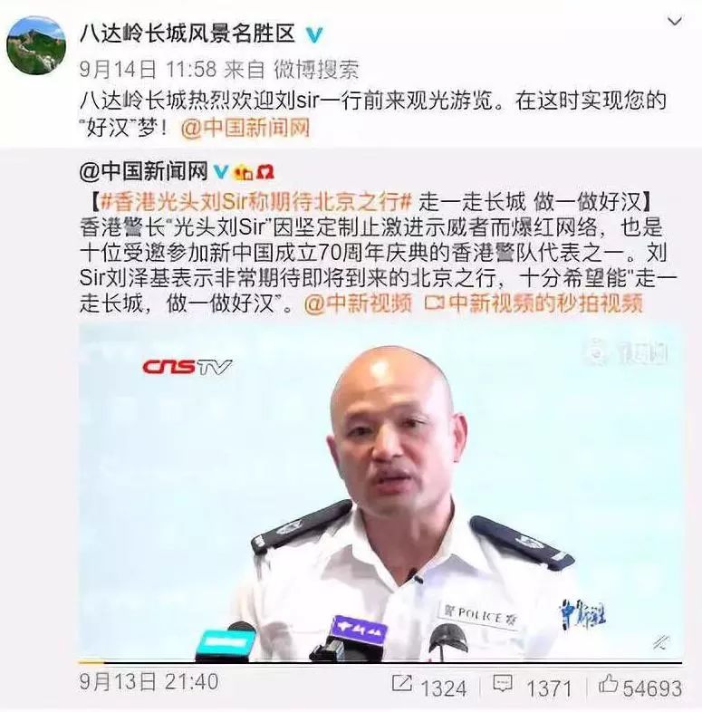 當天劉Sir剛從醫院複診回來。 在7月30日處突過程中,他的膝蓋和右眼受傷,但現在看起來已無大礙。 劉澤基介紹説,明天(29日)他將和7名受傷警員和3名警官一同飛赴北京觀禮,這是中央給香港警隊的特殊禮遇。 説到北京之行,他有兩個最期待的事: 一個是觀看大閲兵,一個就是遊長城,另外他還想嘗一嘗著名的北京烤鴨 。 他説大閲兵將展示新中國70年的國防成就,飛機、坦克、導彈,他都想看。 至於登長城,他説這是他自小的夢想。 小時候就知道“從太空能看長城,就覺得很神奇,長大了一定要去看一看。 他笑言表露這個願望後,很多很多網友勸他千萬不要去,因為國慶節長城人太多了。 就在劉澤基打退堂鼓的時候,長城管理部門聯繫到他,告訴他將為他開闢“綠色通道”,幫助他實現夢想 。 所以可以肯定的是,劉Sir的“好漢”本色將在長城得到“確認”。
