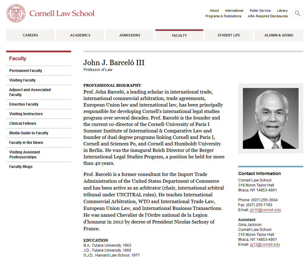 據康奈爾大學官網介紹,擁有美國哈佛大學法學院博士學位的巴塞洛教授,主要從事關於國際貿易與國際經濟一體化等法律方面的研究,涉及貿易法律(WTO、國際貿易法和歐盟法律)和國際商事仲裁。