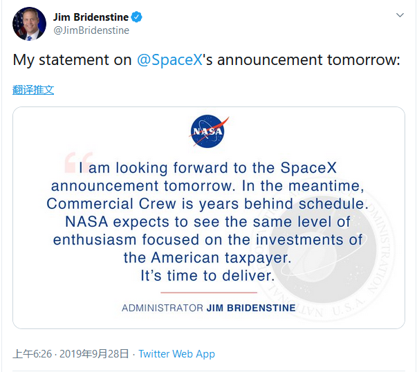 “我期待着SpaceX公司明天的聲明。與此同時,商業載人(項目)的進度已經落後了幾年。NASA希望看到對美國納税人的投資也受到了同樣程度的關注。是時候兑現承諾了。”