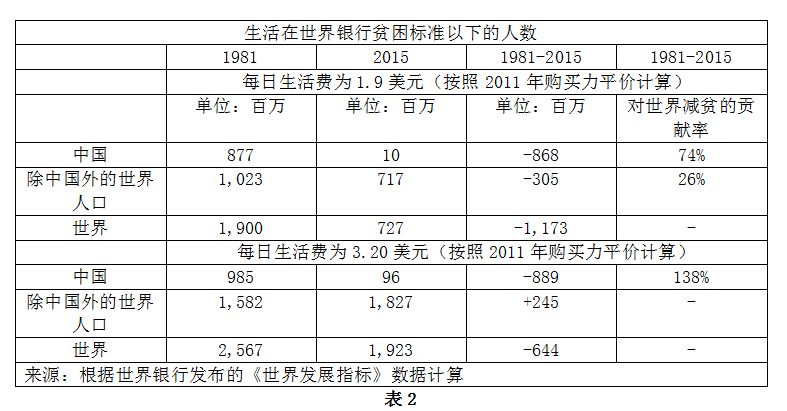 3. 眾所周知,中國在世界減貧方面的成就無與倫比,表2所示的世界銀行最新數據證明了這一點。按照2011年購買力平價計算,世界銀行的極端貧困標準為每天1.90美元。1981-2015年中國對世界減貧的貢獻率為74%。按照2011年購買力平價計算,世界銀行的貧困標準略高一點,為每天3.20美元,世界上生活在這種貧困水平上的人口減少了138%,其中中國的貧困人口減少了8.89億,而世界其他地區的貧困人口則增加了2.45億。雖然貧窮數據表明社會上最貧窮的那部分人生活條件的改善,但預期壽命數據更能體現平均水平——預期壽命的增長説明了中國社會環境的改善惠及了絕大多數普通中國人。
