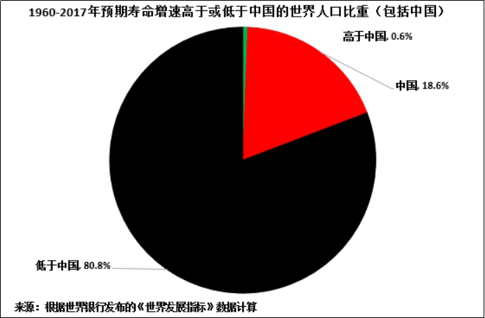 到2017年,中國13.86億人的預期壽命增速高於60.27億人。也就是説,60.27億人生活在預期壽命增速低於中國的國家,只有4600萬人生活在預期壽命增速高於中國的國家。