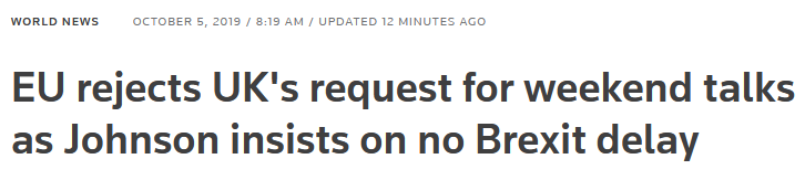 由於英國首相約翰遜重申倘若10月31日無法達成協議,屆時將“硬脱歐”,歐盟拒絕了英國提出在本週末舉行脱歐談判的要求。