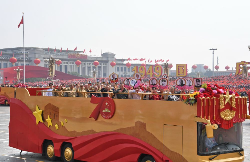 慶祝中華人民共和國成立70週年大會羣眾遊行活動中,老一輩黨和國家、軍隊領導人親屬代表,老一輩建設者和親屬代表,新中國成立前參加革命工作的老戰士,老一輩軍隊退役英模、民兵英模和支前模範代表等乘坐的21輛禮賓車緩緩駛過天安門城樓(10月1日攝)。 新華社記者李欣攝