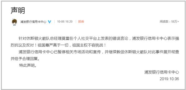 上海浦東發展銀行股份有限公司信用卡中心官方微博發佈聲明,針對休斯頓火箭隊總經理莫雷在個人社交平台上發表的錯誤言論,浦發銀行信用卡中心表示強烈抗議及反對。祖國尊嚴高於一切,祖國主權不容挑戰。通報稱,浦發銀行信用卡中心已暫停相關市場活動和宣傳,並繼續敦促休斯頓火箭隊對此事件展開徹查並給予合理回覆。