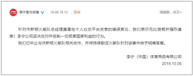 李寧官方微博發佈聲明,針對休斯頓火箭隊總經理莫雷在個人社交平台發表的錯誤言論,表示無比憤慨並強烈譴責!堅決反對並抵制一切損害國家利益的行為。已中止與休斯頓火箭隊相關合作,並將持續敦促火箭隊針對該事件給予明確答覆。