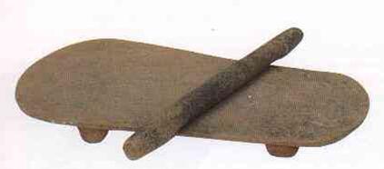 ↑新鄭縣出土的裴李崗文化時期的石磨盤、石磨棒