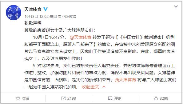 10月8日,@天津體育發佈致歉聲明稱,10月7日16:47分,@天津體育 轉發了題為【《中國女排》裁判泄密!鞏俐版郎平正面照流出,原班人馬都來了】的博文,在審核中未能發現原文所配的圖片以馬賽克遮擋惠若琪女士,因我們工作失誤造成不良影響。在此,鄭重向惠若琪女士,以及球迷朋友們致歉!