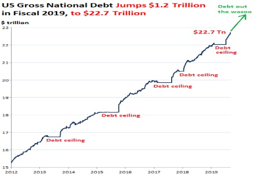 據第一財經10月9日報道,美國財政部最新公佈的數據顯示,2019財年美國國家債務總額新增1.2萬億美元,達到創紀錄的22.72萬億美元,相當於本財年GDP的106.5%。