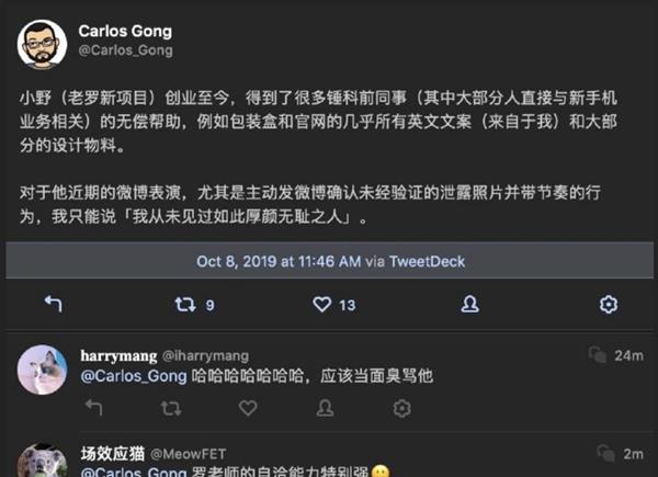 此事的起因和羅永浩的“大嘴巴”有關,羅永浩之前曝光了一款小野未發佈的產品,導致小野內部有人不滿,前錘子科技產品經理Carlos Gong(卡洛斯)在社交媒體發文稱:“小野(老羅新項目)創業至今,得到了很多錘科前同事的無償幫助,例如包裝盒和官網的幾乎所有英文文案和大部分的設計物料。對於他近期的微博表演,尤其是主動發微博確認未經驗證的泄露照片並帶節奏的行為,我只能説‘我從未見過如此厚顏無恥之人’。”