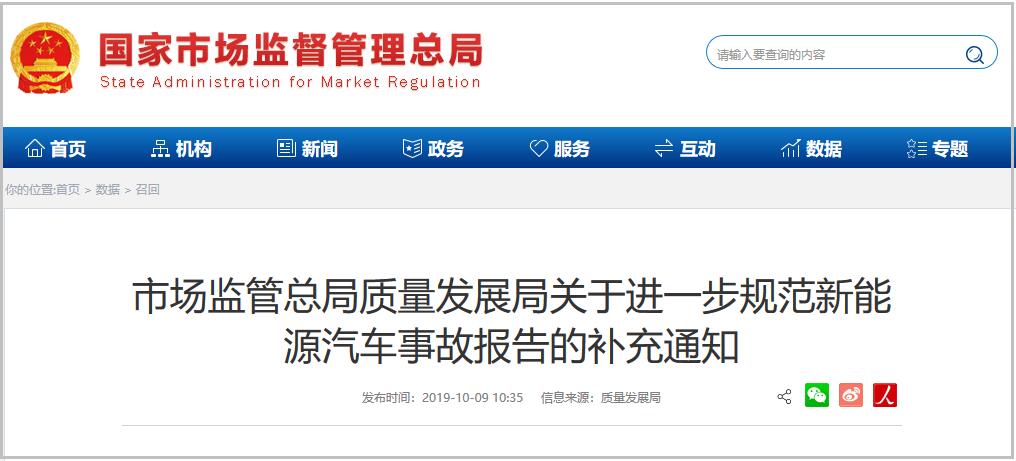 市場監管總局網站消息,市場監管總局質量發展局10月9日發佈關於進一步規範新能源汽車事故報告的補充通知。