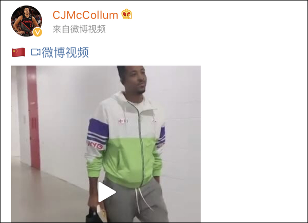 波特蘭開拓者隊的球員CJ,今天中午也發佈了一條微博,配圖是中國國旗。