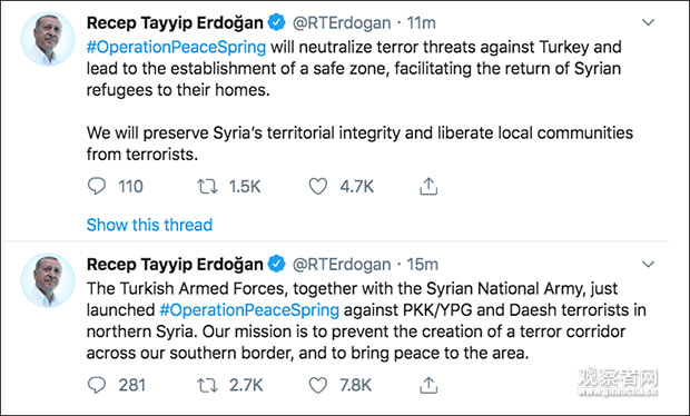 9日晚間,埃爾多安在推特上寫道,土耳其武裝部隊及其土耳其支持的敍利亞國民軍(Syrian National Army)剛剛在敍利亞北部對庫爾德工人黨、庫爾德人民保衞軍和伊斯蘭極端恐怖分子(“達伊沙”)發動了和平行動。