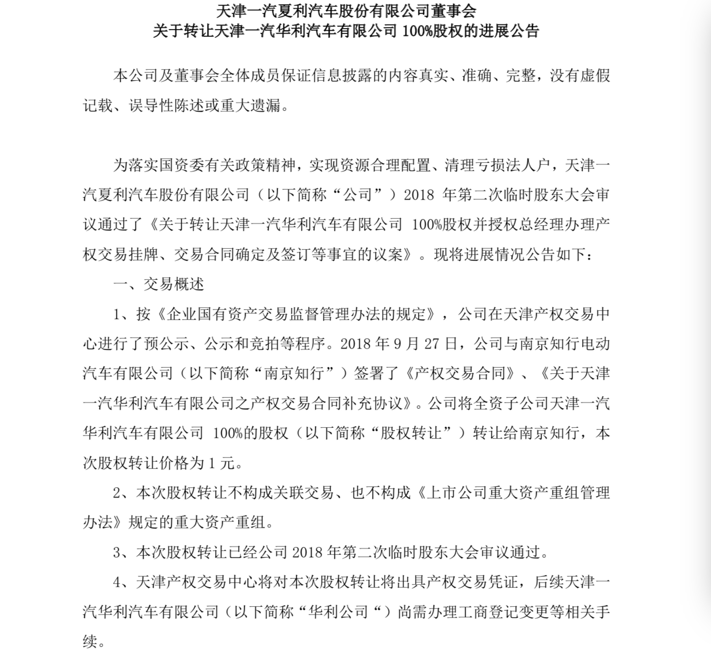 一汽夏利轉讓一汽華利股權公告