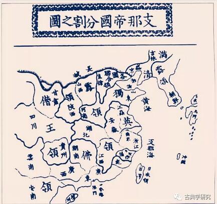 與瓜分波蘭分三次完成(1773,1793,1795)一樣,瓜分中國同樣分三步走。福澤諭吉在文中畫了一幅地圖題為“支那帝國分割之圖”:清室僅剩下自己的發祥地東三省,德國控制山東和河南,俄國佔據朝鮮、陝西和山西,英國分走江蘇、安徽、浙江、河北和江西,法國奪得安南、越南、湖南、廣西、廣東和福建西部,日本佔領台灣和福建東部,“漢族僭王”僅分得西部的甘肅、四川和貴州。福澤諭吉依據西方的國際法推論説,若一國獨吞中國必然招致多國譴責甚至干涉,而多國瓜分一國則不會引起麻煩,所有國家共同承擔責任,每個國家的道德過錯就微不足道了。[16]