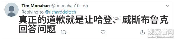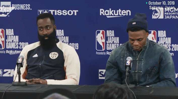 而10日坐在哈登邊上的威斯布魯克,也就是哈登7日“道歉”時站在他身邊的那位。