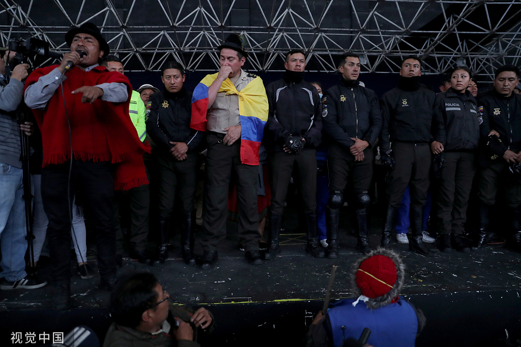 在厄瓜多爾首都基多,數千名土著示威者佔領了一個文化劇院,並將其設為反對派基地。當地時間10日,這些抗議者劫持了8名警察,沒收摩托車,命令他們脱下身上包括頭盔、防彈衣、靴子在內的裝備,之後將他們推上舞台示眾。