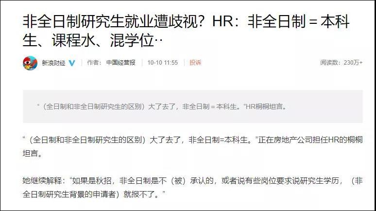 有媒體報道稱,近日,有不少學生反映,有企業在招聘問答環節中直接明確回覆,“不招收非全日制研究生”,有的HR更是直接表明,全日制和非全日制研究生的區別大了去了,“非全日制=本科生”。