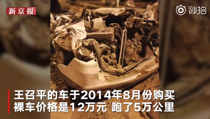 “就是這個車,當時這個方向看的。就剩下這一點,後屁股。按説是我的位置(駕駛員),你看看成啥樣了?我都後怕。”王召平説道,“光看了一點點,連牌子都看不到。前面直接壓沒了,後面後備箱還能剩下一點。備胎不是(在)後備箱裏面嘛,就這麼一個完整的東西。尤其是挖出那個車,我就感覺,我要是在裏面,連個屍首的模樣都看不到了。”