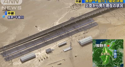 據日本放送協會(NHK)13日報道,由於流經長野縣的千曲川潰堤,東日本鐵路公司(JR)位於長野站不遠處的新幹線車庫被淹,目前已確認有10列新幹線受損。