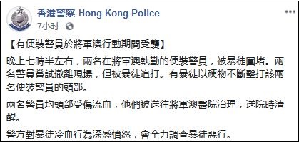 香港警方13日發表聲明,當天晚上7點30分左右,有兩名在將軍澳執勤的便衣警察,被暴徒圍堵。兩名警察曾嘗試撤離現場,但仍被暴徒追打,甚至有暴徒不斷以硬物擊打兩名警察頭部。