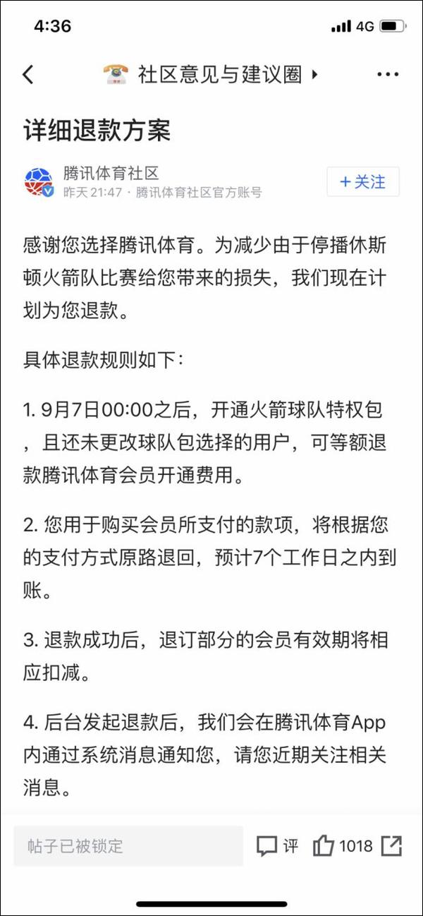 在騰訊體育社區,騰訊還列出了詳細的退款方案,具體退款規則有:9月7日00:00之後,開通火箭球隊特權包,且還未更改球隊包選擇的用户,可等額退款騰訊體育會員開通費用;用於購買會員所支付的款項,將根據支付方式原路退回,預計7個工作日之內到賬;同時退款成功後,退訂部分的會員有效期將相應扣減。
