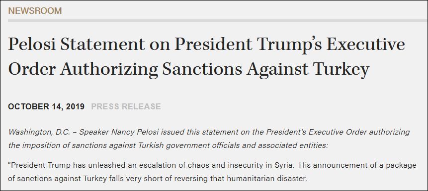 根據美國政府網站,14日,佩洛西就特朗普對土耳其實施制裁的總統行政命令發表聲明,她表示,“特朗普總統讓敍利亞的混亂和不安全局勢升級。他宣佈了對土耳其的一攬子制裁措施,但未能扭轉這一人道主義災難。”
