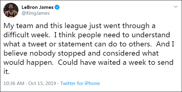 Dave Mcmenamin寫道,用詹姆斯的話來説,如果一名球員因為他所説的話或所發的推文而引起同樣的騷動,他將無法置身事外,聯盟會對球員有所處置。所以,詹姆斯想知道,肖華要怎麼處理莫雷的事情?