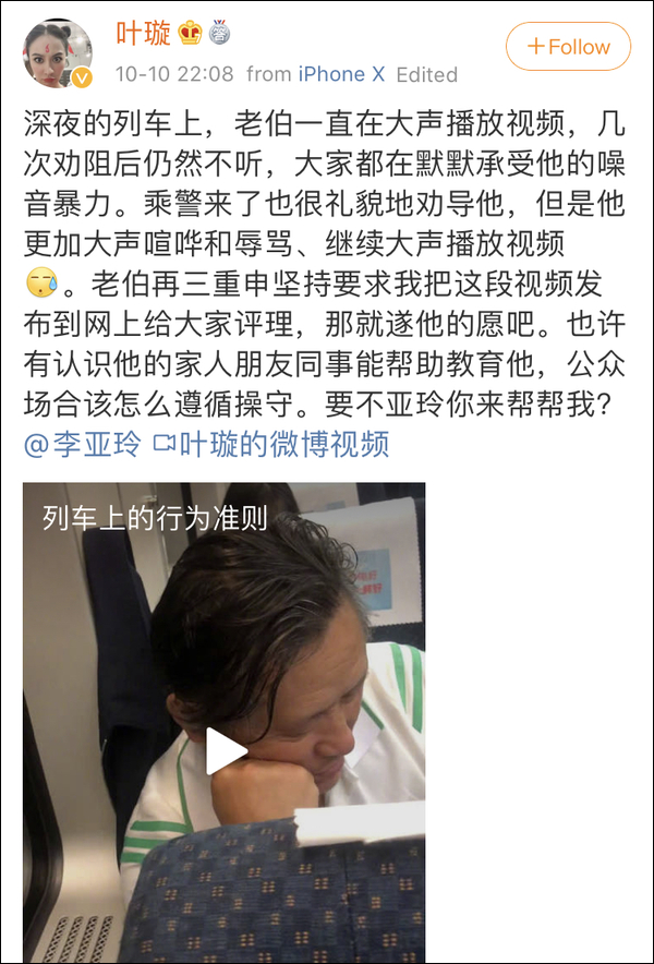據悉,葉璇並沒有對高鐵外放男的喊話作出任何回應,也沒有刪除高鐵上錄製的那段備受熱議的曝光視頻。