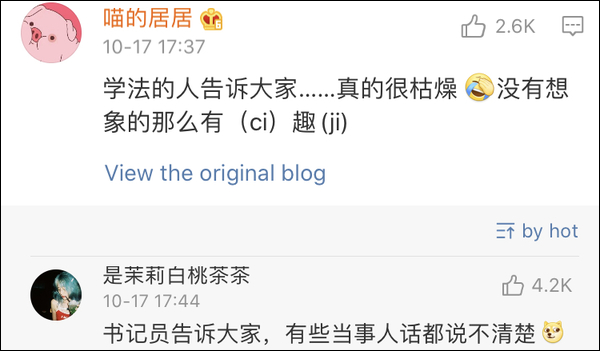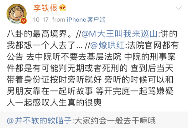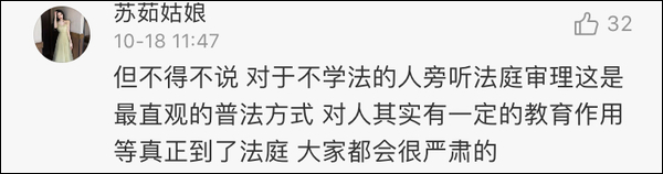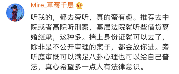 “法院官網都有公告,去中院聽不要去基層法院……旁聽的時候可以和男朋友靠在一起聽故事,等開完庭一起罵嫌疑人一起感嘆人生真的很爽。”