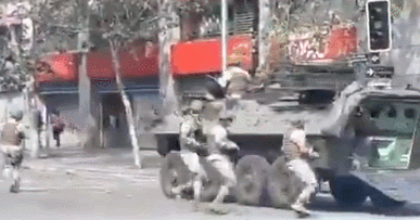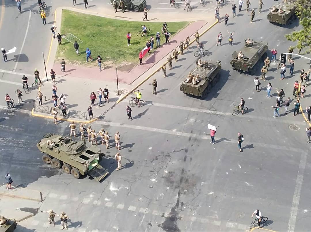 19日白天,智利軍方乘裝甲車在市內鋪開(社交媒體 圖)