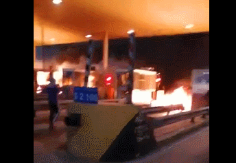 暴力示威者縱火燒燬了聖地亞哥北部的一處通行站 推特視頻截圖