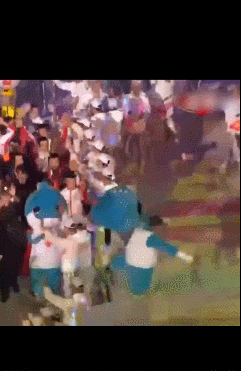 一名穿着兵兵表演服的表演者不慎摔倒,吉祥物頭套也掉落,表演者立馬爬起來,戴上頭套,並堅強地繼續舞蹈。