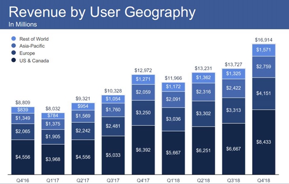 北美地區(圖中深藍色)可以佔到Facebook總財源的幾乎一半(數據來源:CNBC)