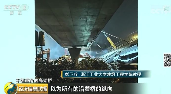 浙江工業大學建築工程系教授 彭衞兵:獨柱墩這種結構性形式,它不是説沒有辦法抗傾覆,但是以前為什麼會出現這麼多問題?就是橋樑專家也好,或者説這個在規範編制上,沒有想到在這種大規模的超載作用下,發生這種破壞形勢。