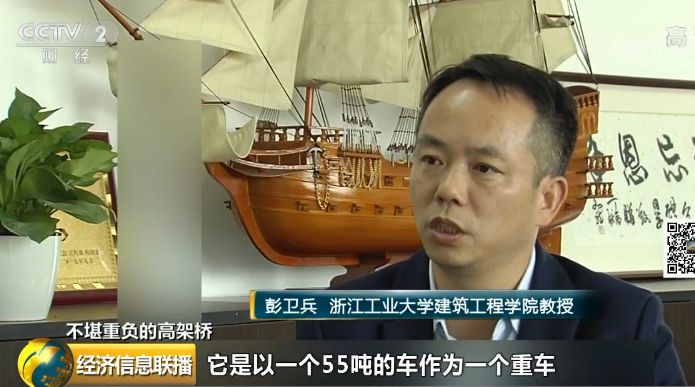 浙江工業大學建築工程學院教授 彭衞兵:我們規定的標準的車輛核載,就是在做橋樑設計的時候,它是以一個55噸的車作為一個重車輔以幾輛20噸的車,形成一個車隊來做橋樑設計的。事故車的車重比我們標準的車輛核載55噸是遠遠超過,所以我們做出這個超載的判斷。